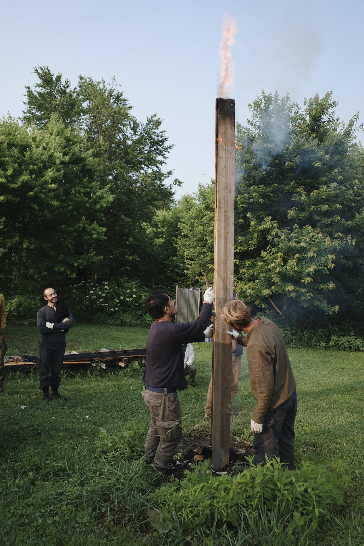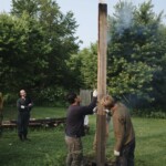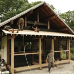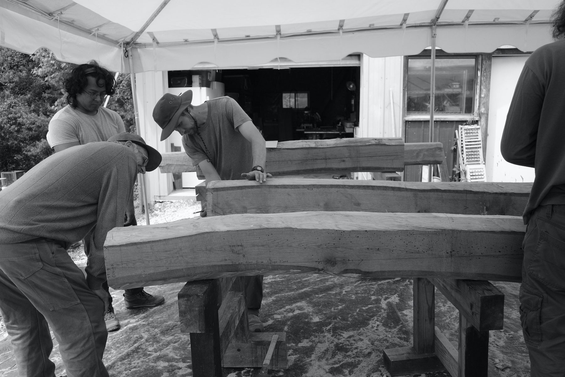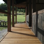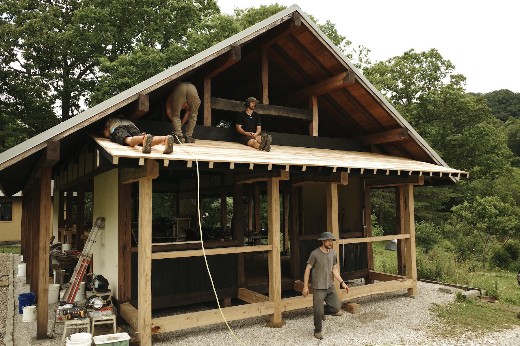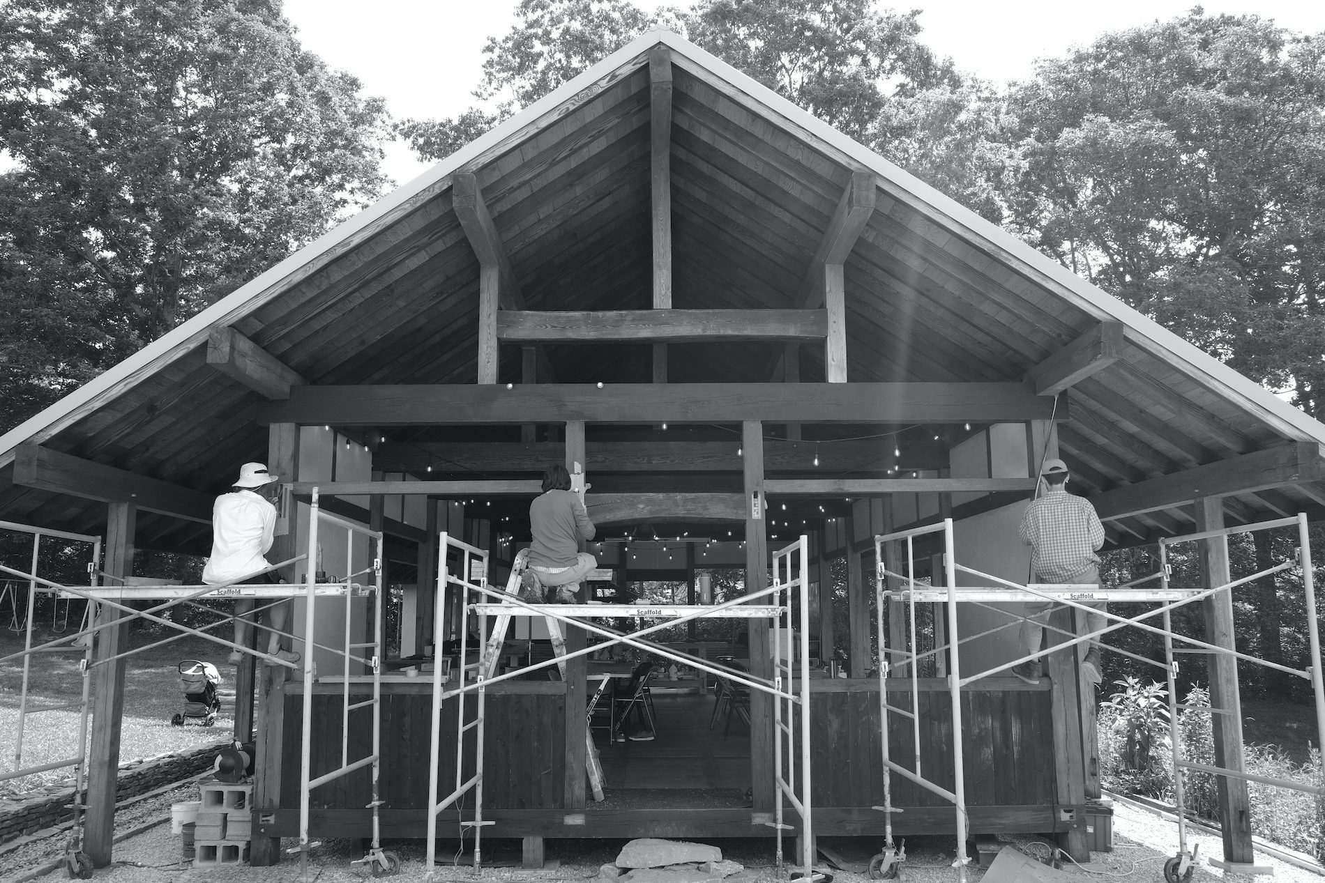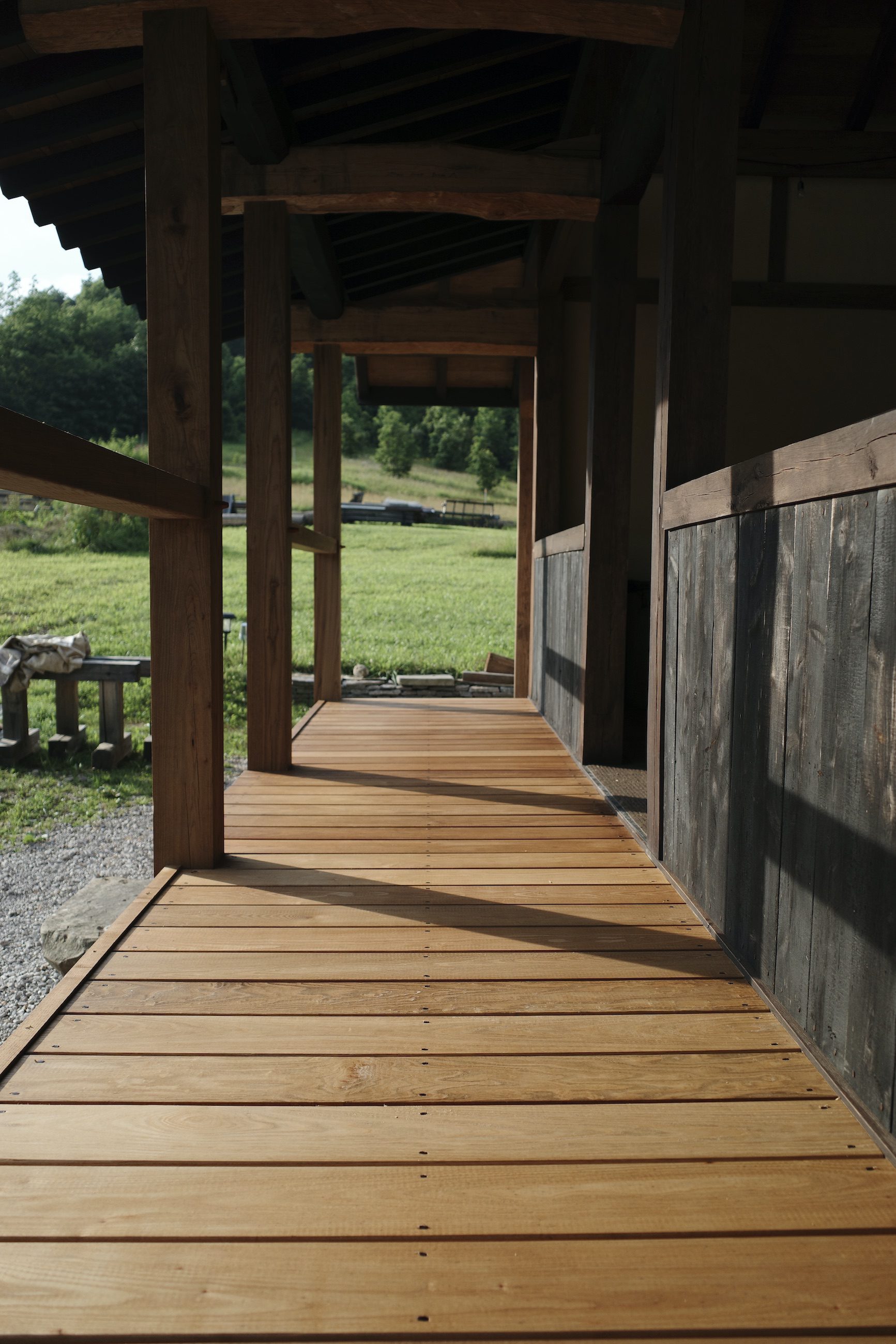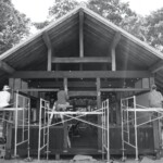 In the days since the workshops have ended, I’ve been enjoying the new pavilion facade from a distance and up close – looking at it from the back porch of our house, and admiring the hewn beams and scribed joints.
